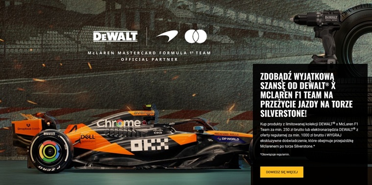 Za zakup jednego produktu DEWALT® x McLaren F1 Team otrzymasz aż 2 losy.