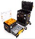 Wieża TSTAK (DWST1-71195 Skrzynia TSTAK(TM) VI duża o pojemności 23 l, DWST1-70705 Skrzynia TSTAK(TM) III z głąboką szufladą 6 organizerów, DWST1-71194 Skrzynia TSTAK(TM) V z przeźroczystą pokrywą i organizerami, DWST1-70703 Skrzynia TSTAK(TM) II wypełniona pianką, uchyt krótki, DWST1-71229 Platforma jezdna do skrzyń TSTAK(TM) + owijka POS )